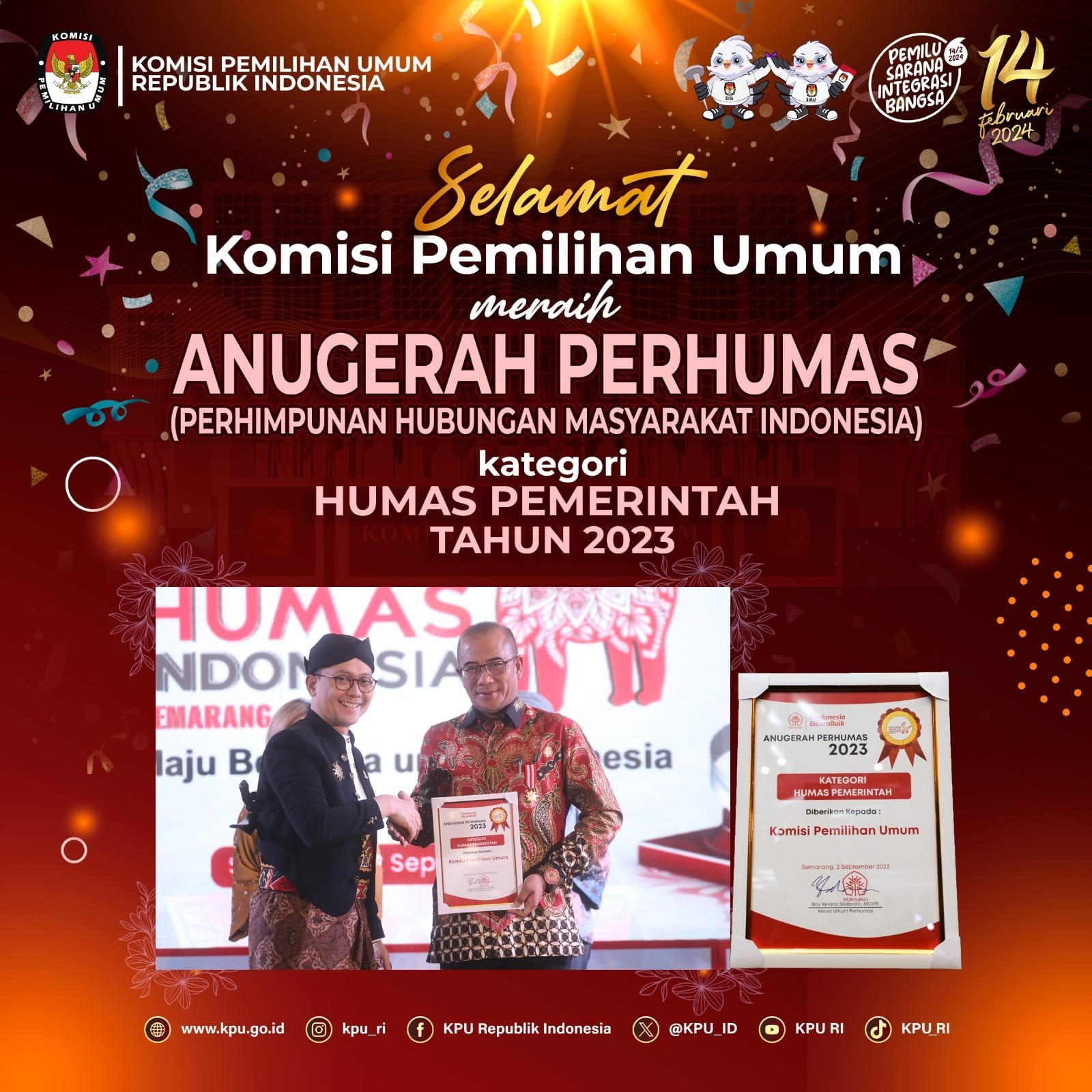 #TemanPemilih, KPU menerima Anugerah (Humas Terbaik) Kategori Humas Pemerintah, dari Perhimpunan Hubungan Masyarakat Indonesia (Perhumas), di Semarang, Sabtu, 2 September 2023. Semoga menjadi motivasi bagi peningkatan layanan kehumasan KPU kepada masyarakat.