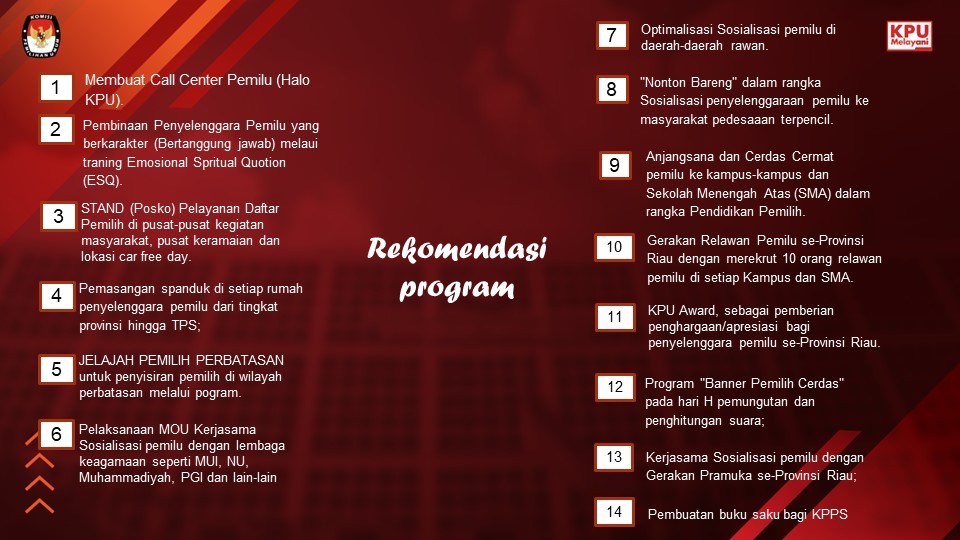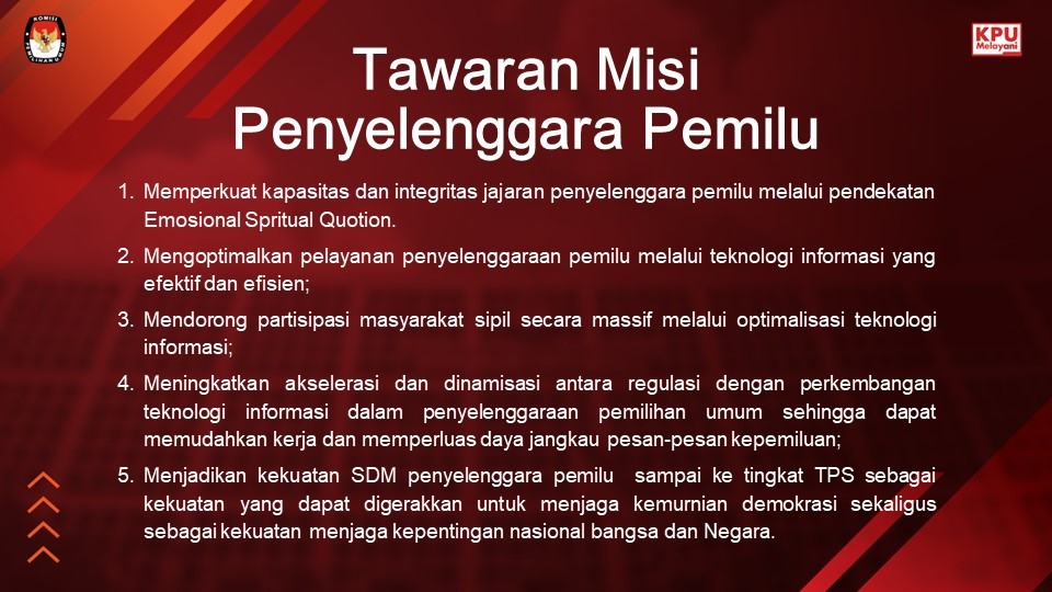 Ketua KPU Provinsi Riau, Rusidi Rusdan, memaparkan materi mengenai Kepemiluan dan permasalahannya di Indonesia serta menyampaikan misi dan program dalam menghadapi Pilkada Serentak Tahun 2024. Pada akhir materi juga disampaikan pentingnya solidaritas antar penyelenggara di KPU Provinsi dan KPU Kabupaten/Kota.