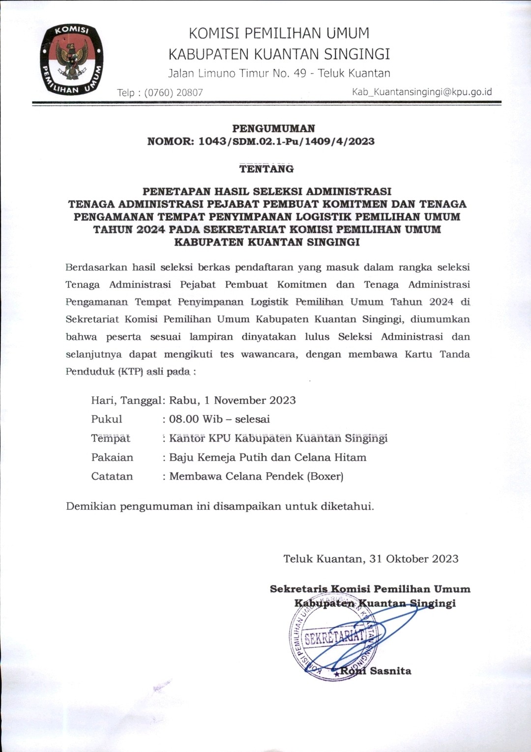 PENGUMUMAN PENETAPAN HASIL SELEKSI ADMINISTRASI TENAGA ADMINISTRASI PPK DAN TENAGA PENGAMANAN PENYIMPANAN LOGISTIK PEMILU TAHUN 2024