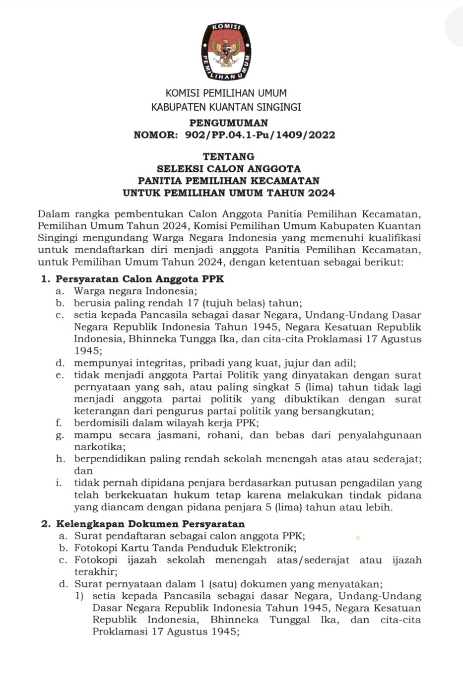Pengumuman Seleksi Calon Anggota PPK untuk Pemilu Tahun 2024