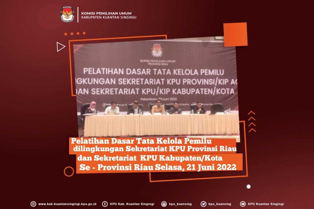 Selasa, 21 Juni 2022, bertempat di Hotel Premiere Pekanbaru seluruh Sekretariat KPU Kuansing mengikuti Pelatihan Dasar Tata Kelola Pemilu di Lingkungan Sekretariat KPU Provinsi dan Sekretariat KPU Kabupaten/Kota Se- Riau, acara dihadiri oleh Anggota KPU Republik Indonesia Parsadaan Harahap, Ketua dan Anggota KPU Provinsi Riau, Sekretaris KPU Provinsi Riau, Kapuslatlitbang serta narasumber Tim Pakar Nazir Salim Manik dan Tenaga Ahli Mohamad Fadlillah, serta seluruh PNS Sekretariat KPU se-Provinsi Riau.