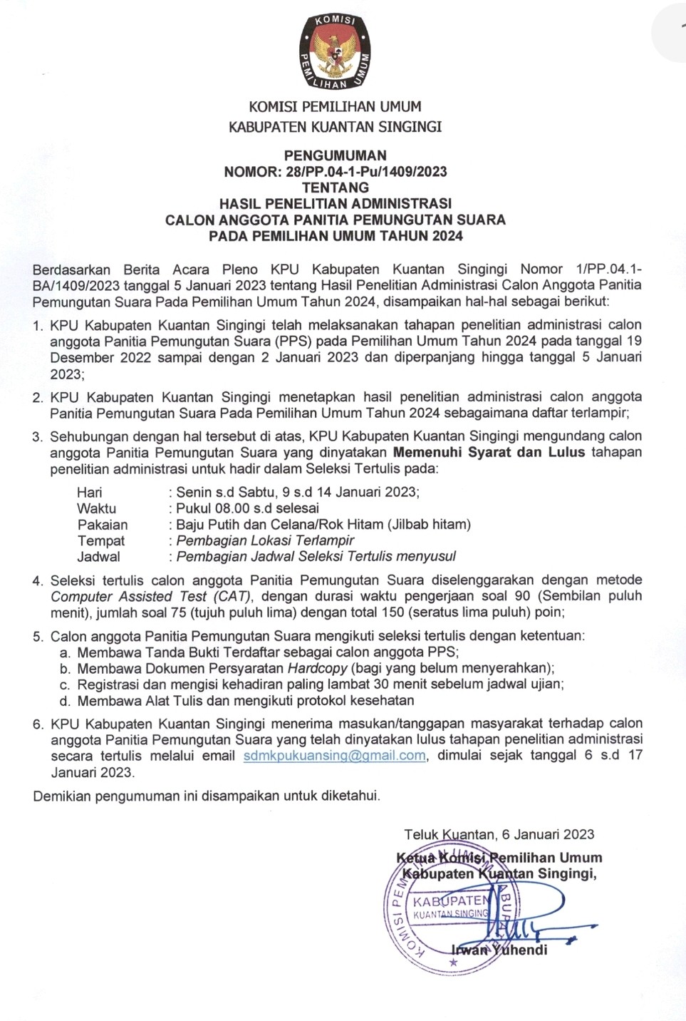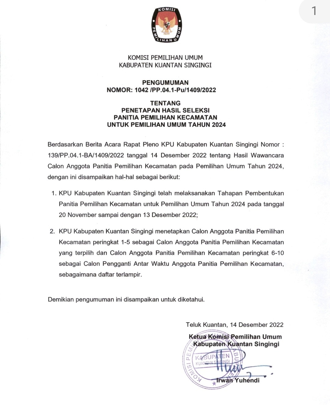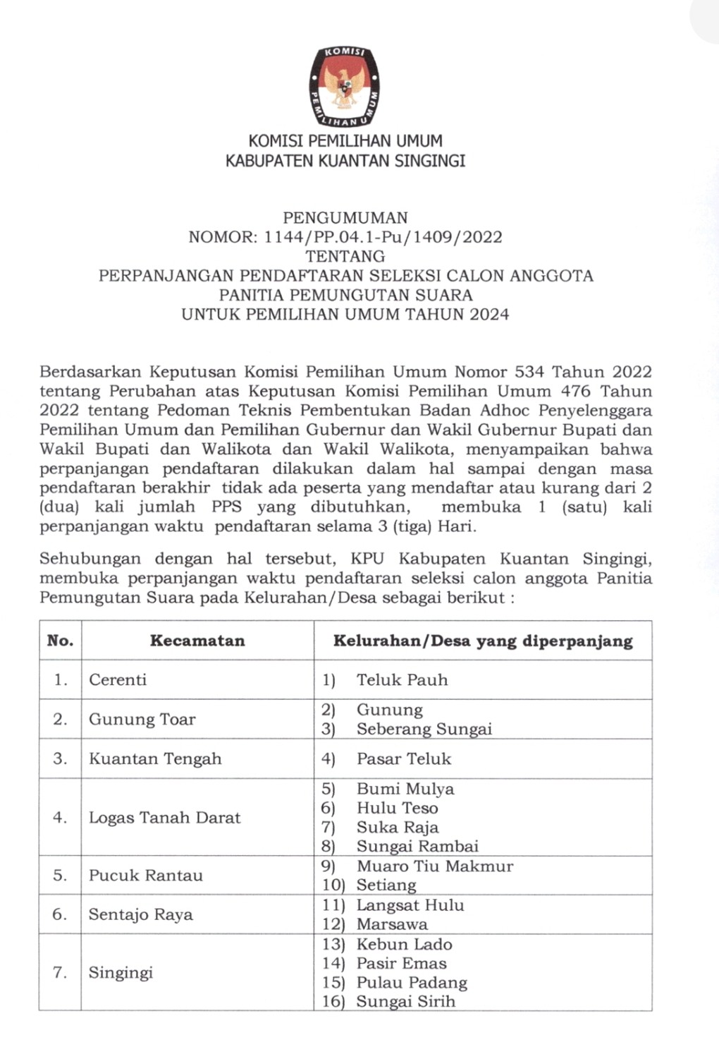 PENGUMUMAN PENETAPAN HASIL SELEKSI PPK UNTUK PEMILU TAHUN 2024 Rabu, 14 Desember 2022 00:00 1176 PENGUMUMAN PENETAPAN HASIL SELEKSI PANITIA PEMILIHAN KECAMATAN UNTUK PEMILIHAN UMUM TAHUN 2024 KLIK DI SINI Baca Selengkapnya