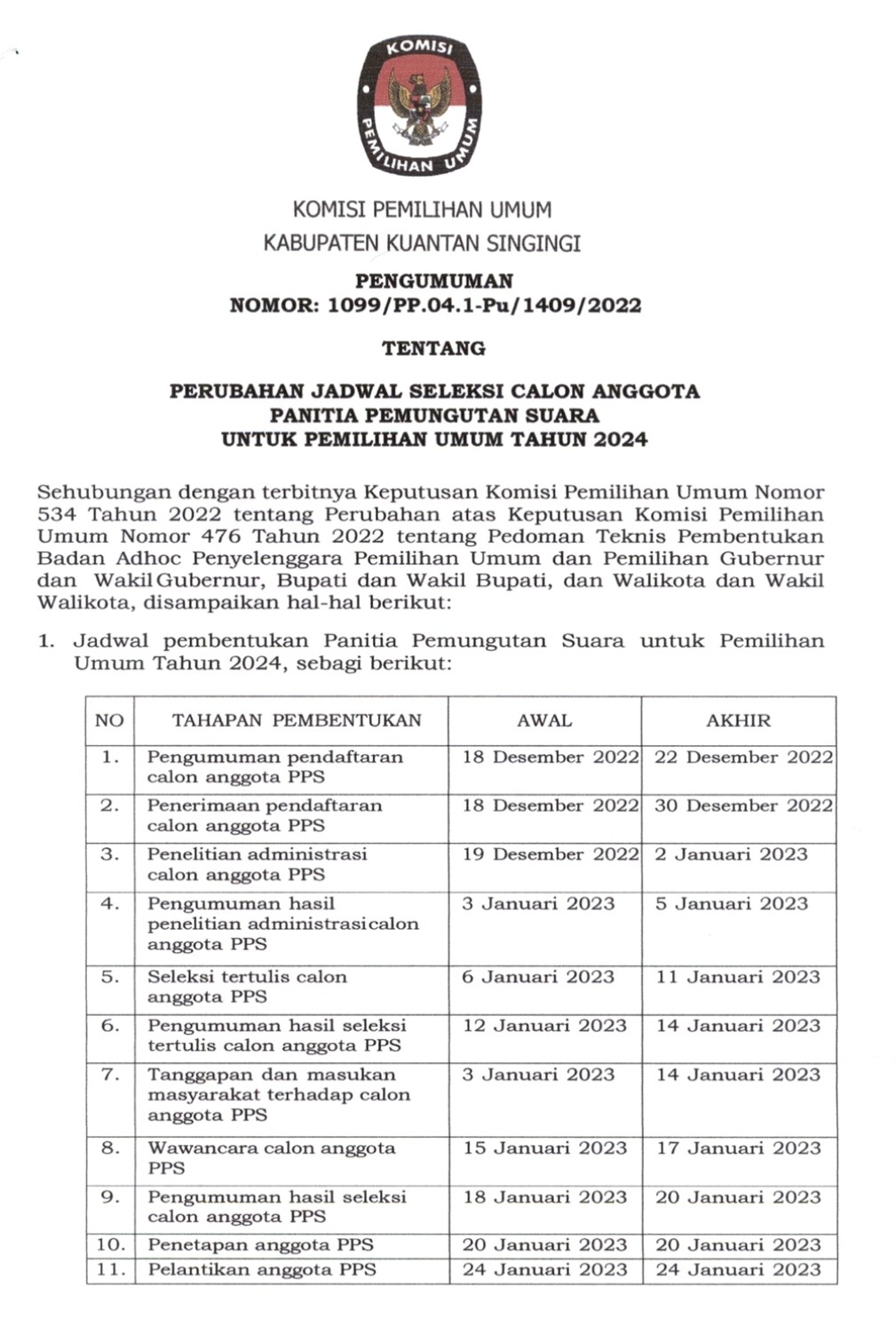 PENGUMUMAN PERUBAHAN JADWAL SELEKSI CALON ANGGOTA PPS UNTUK PEMILU TAHUN 2024 Kamis, 22 Desember 2022 00:00 1316 PENGUMUMAN PERUBAHAN JADWAL SELEKSI CALON ANGGOTA PPS UNTUK PEMILU TAHUN 2024 KLIK DISINI Baca Selengkapnya