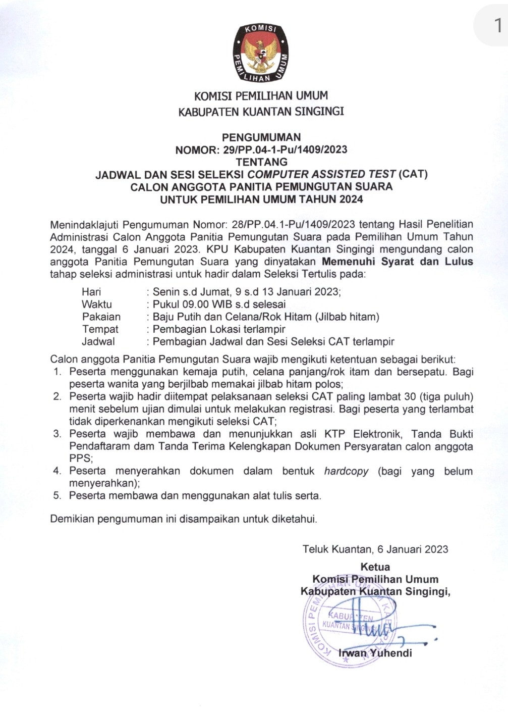 PENGUMUMAN JADWAL DAN SESI SELEKSI CAT CALON ANGGOTA PPS UNTUK PEMILU TAHUN 2024 Sabtu, 07 Januari 2023 00:00 1008 PENGUMUMAN JADWAL DAN SESI SELEKSI CAT CALON ANGGOTA PPS UNTUK PEMILU TAHUN 2024 KLIK DISINI Baca Selengkapnya