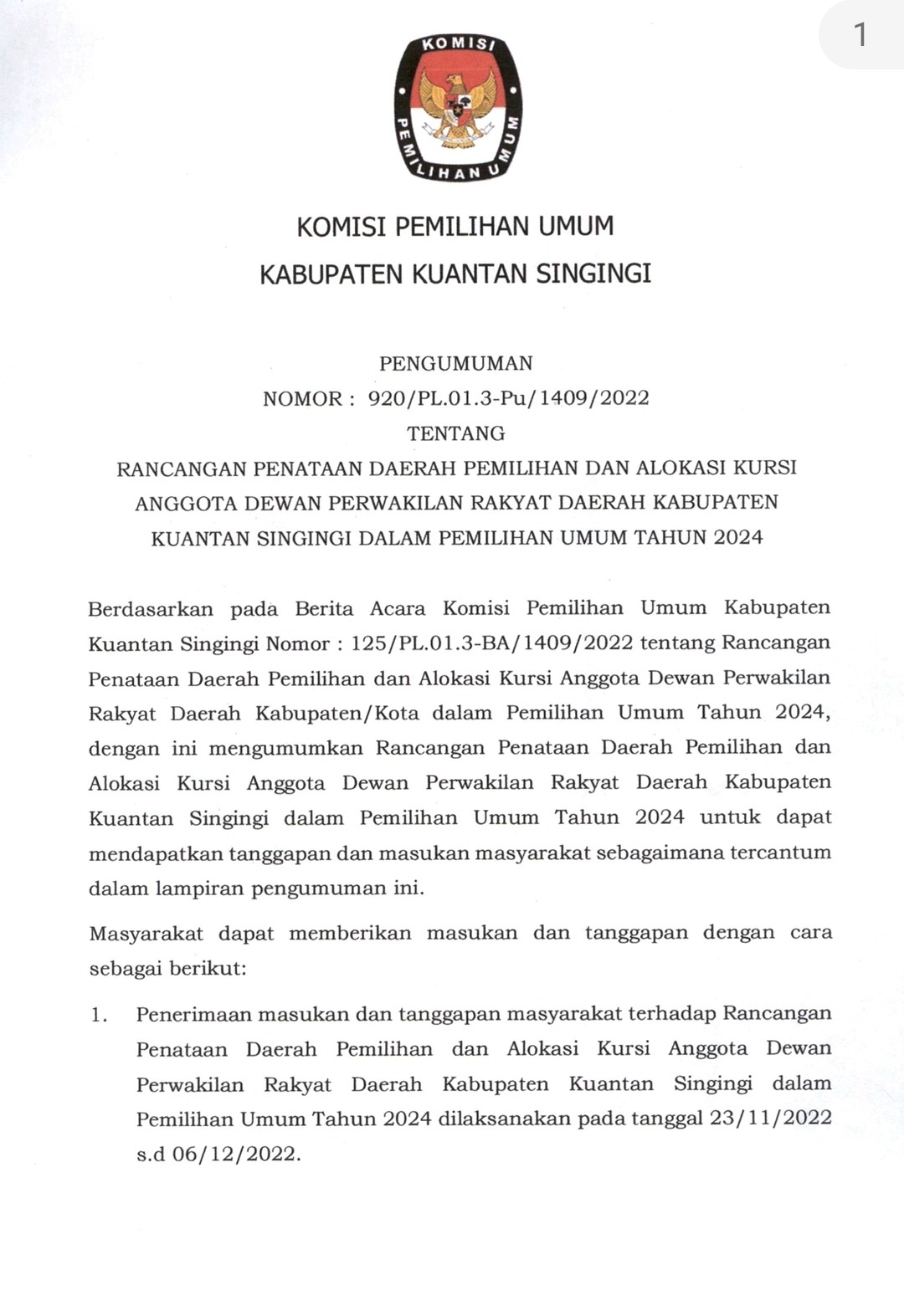 PENGUMUMAN RANCANGAN DAERAH PEMILIHAN DAN ALOKASI KURSI ANGGOTA DPRD KABUPATEN KUANTAN SINGINGI DALAM PEMILU TAHUN 2024 Rabu, 23 November 2022 00:00 1191 Pengumuman Rancangan Daerah Pemilihan dan Alokasi Kursi Anggota DPRD Kabupaten Kuantan Sinigngi dalam Pemilu Tahun 2024. Selengkapnya dapat Klik disini Untuk formulir tanggapan masyarakat dapat diunduh disini Baca Selengkapnya