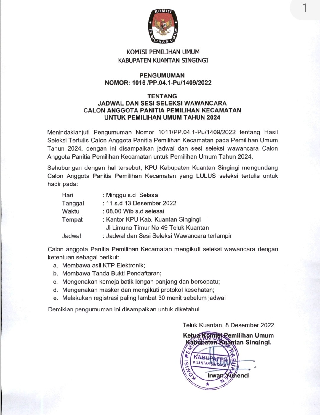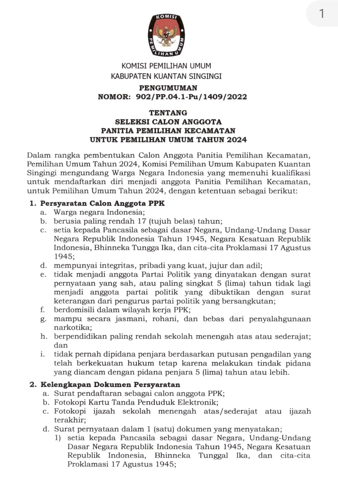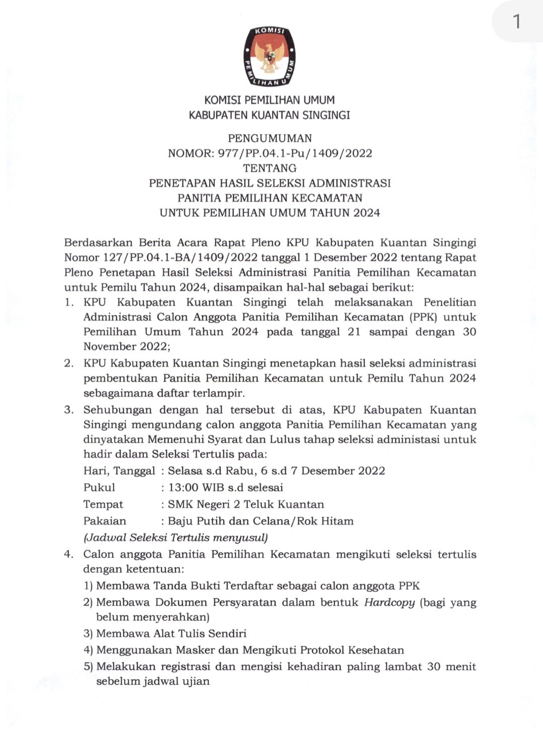 PENGUMUMAN SELEKSI CALON ANGGOTA PPK UNTUK PEMILU TAHUN 2024 Kamis, 08 Desember 2022 00:00 206 PENGUMUMAN SELEKSI CALON ANGGOTA PPK UNTUK PEMILU TAHUN 2024 KLIK DISINI Baca Selengkapnya