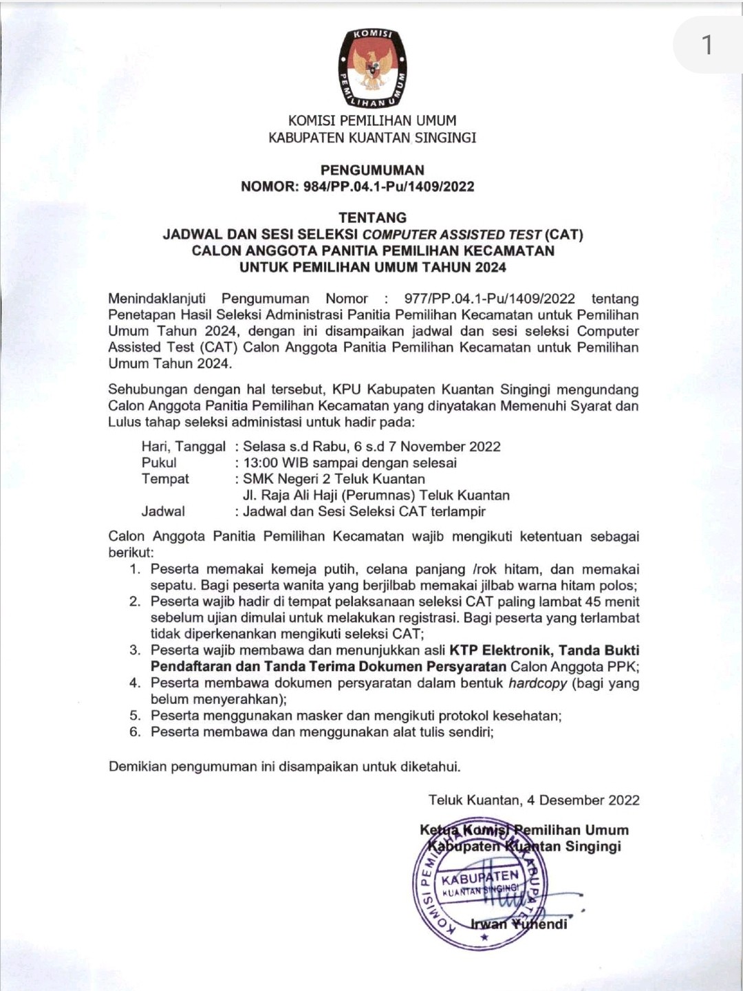 PENGUMUMAN JADWAL DAN SESI SELEKSI CAT CALON ANGGOTA PPK UNTUK PEMILU TAHUN 2024 Senin, 05 Desember 2022 00:00 1153 Pengumuman Jadwal dan Sesi Seleksi CAT Calon Anggota PPK untuk Pemilu Tahun 2024 Klik disini Baca Selengkapnya