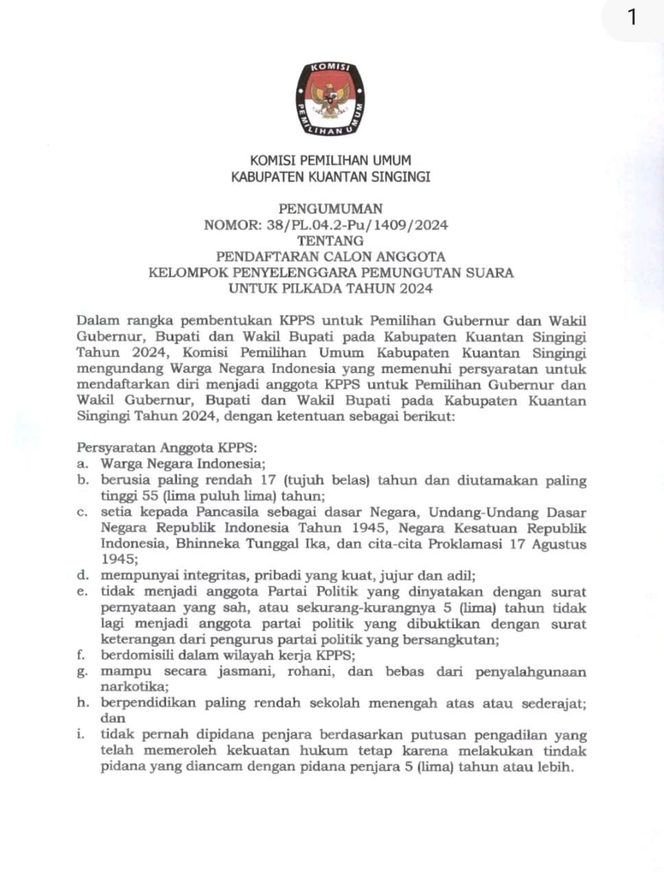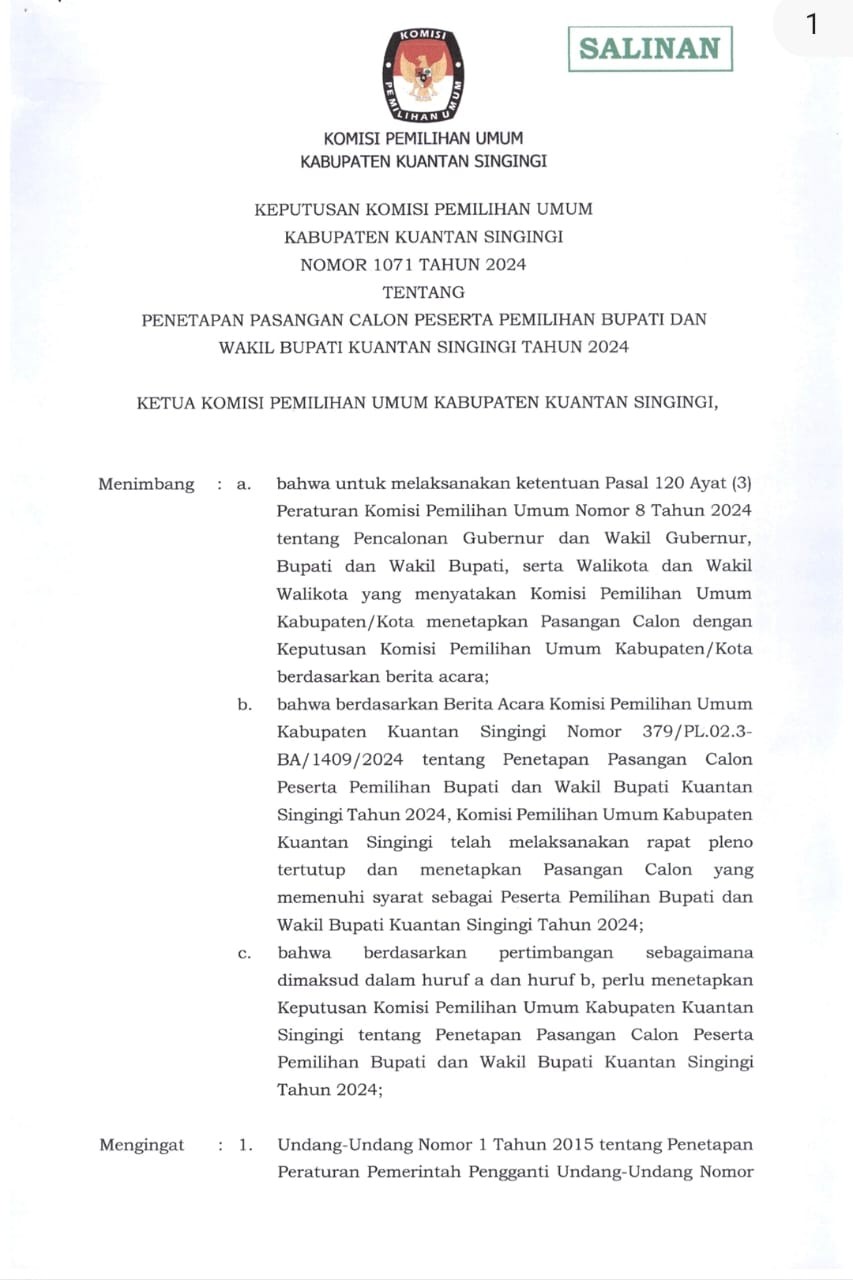PENETAPAN PASANGAN CALON PESERTA PEMILIHAN BUPATI DAN WAKIL BUPATI KUANTAN SINGINGI TAHUN 2024 Minggu, 22 September 2024 00:00 1046 PENETAPAN PASANGAN CALON PESERTA PEMILIHAN BUPATI DAN WAKIL BUPATI KUANTAN SINGINGI TAHUN 2024 Baca Selengkapnya