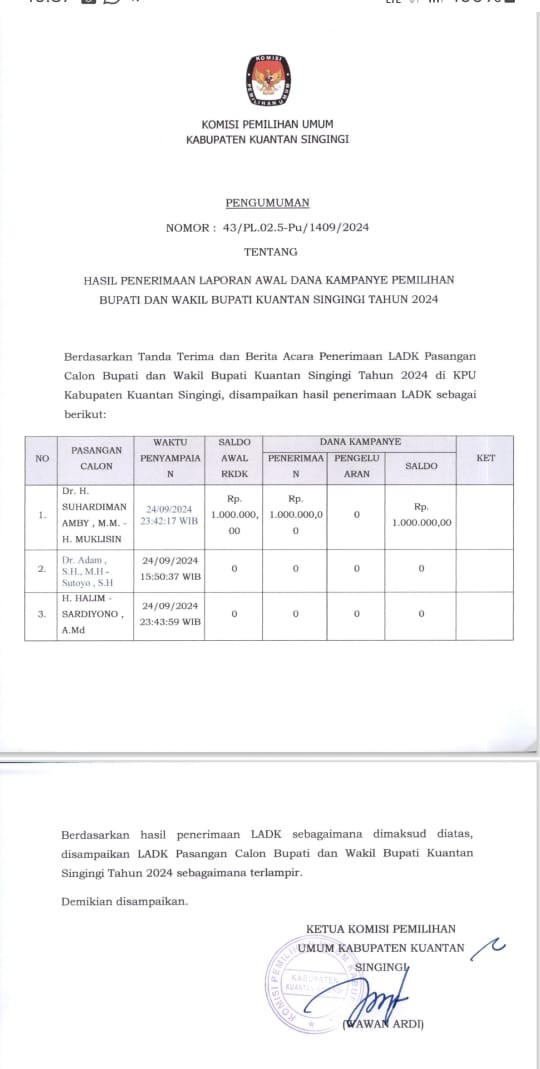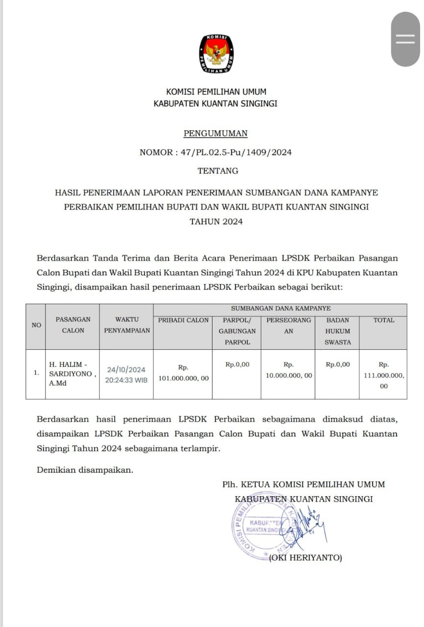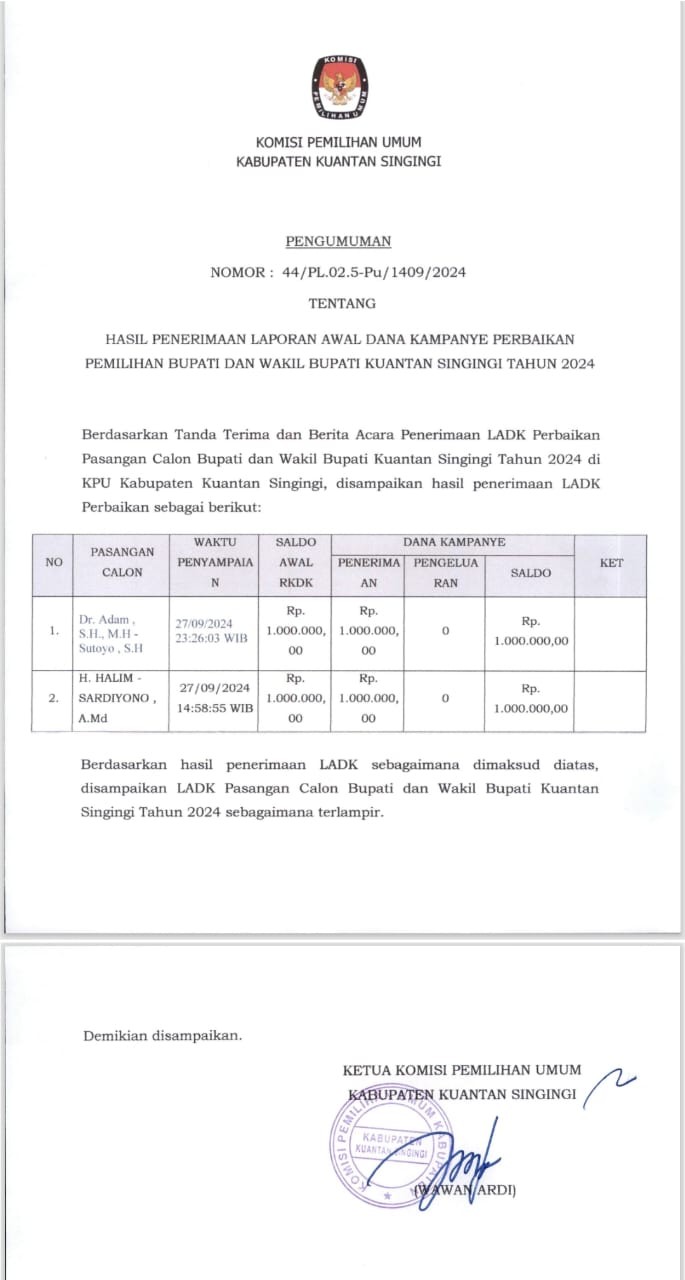 PENGUMUMAN HASIL PENERIMAAN LAPORAN AWAL DANA KAMPANYE PEMILIHAN BUPATI DAN WAKIL BUPATI KUANTAN SINGINGI TAHUN 2024 Sabtu, 28 September 2024 00:00 970 PENGUMUMAN HASIL PENERIMAAN LAPORAN AWAL DANA KAMPANYE PEMILIHAN BUPATI DAN WAKIL BUPATI KUANTAN SINGINGI TAHUN 2024 Baca Selengkapnya