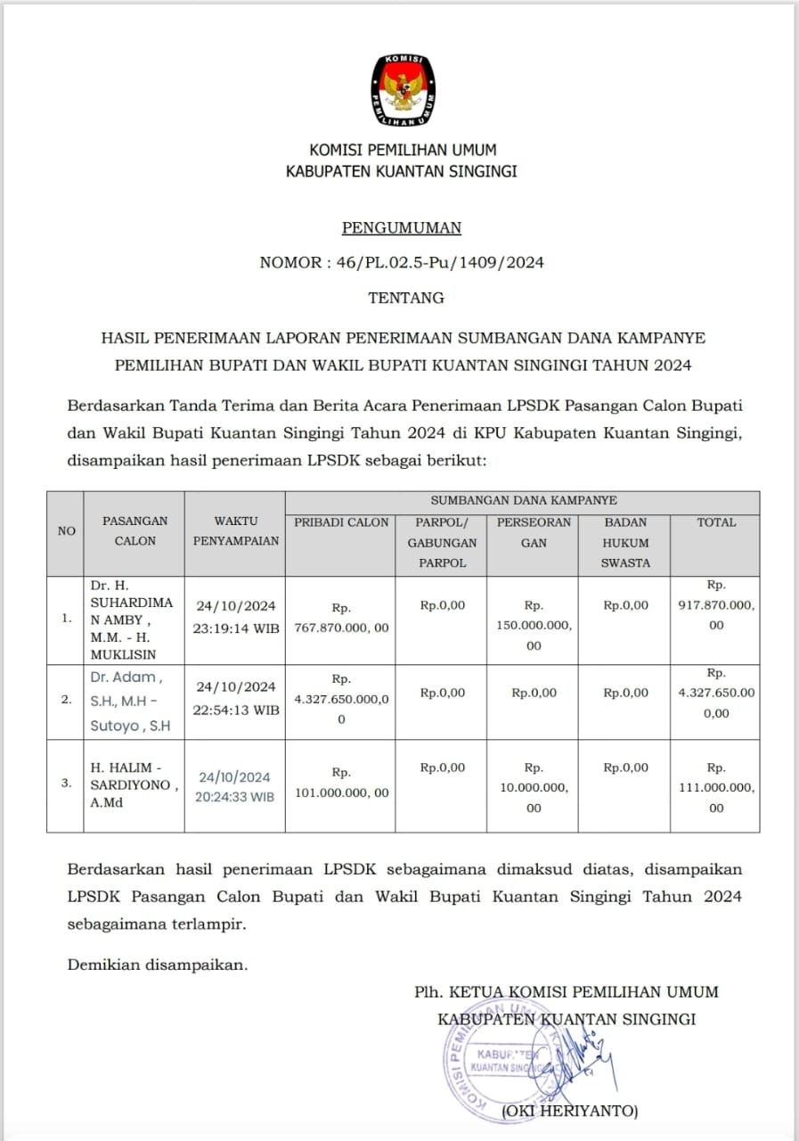HASIL PENERIMAAN LAPORAN PENERIMAAN SUMBANGAN DANA KAMPANYE PERBAIKAN PEMILIHAN BUPATI DAN WAKIL BUPATI KUANTAN SINGINGI TAHUN 2024 Sabtu, 26 Oktober 2024 00:00 1007 HASIL PENERIMAAN LAPORAN PENERIMAAN SUMBANGAN DANA KAMPANYE PERBAIKAN PEMILIHAN BUPATI DAN WAKIL BUPATI KUANTAN SINGINGI TAHUN 2024 Baca Selengkapnya
