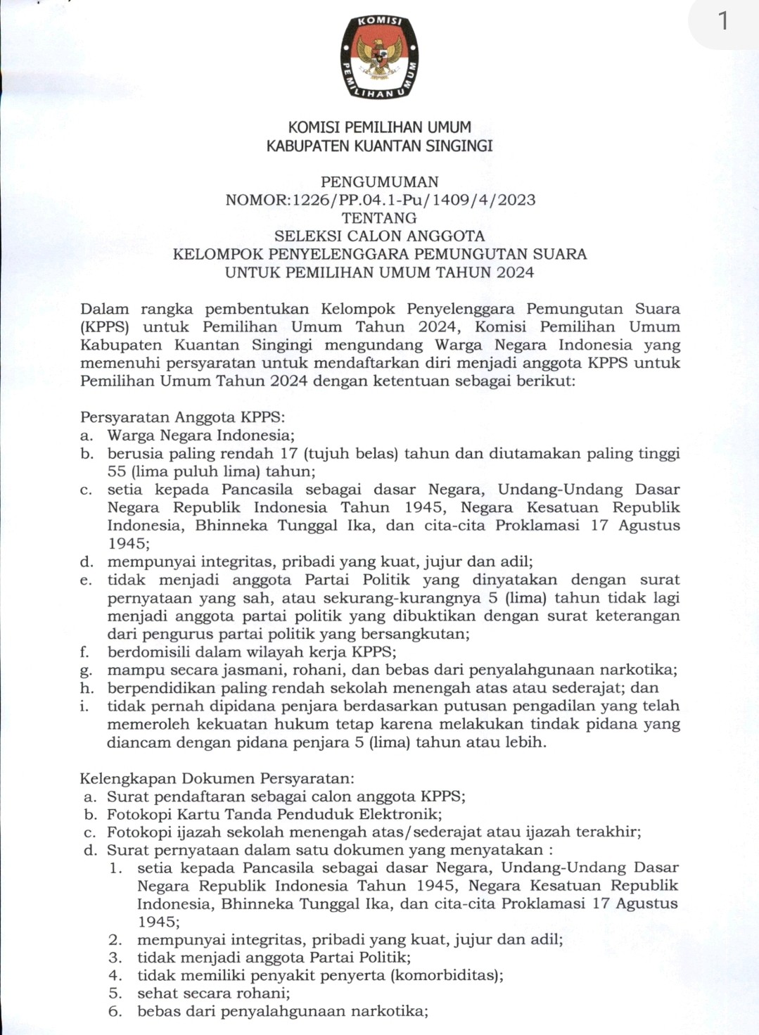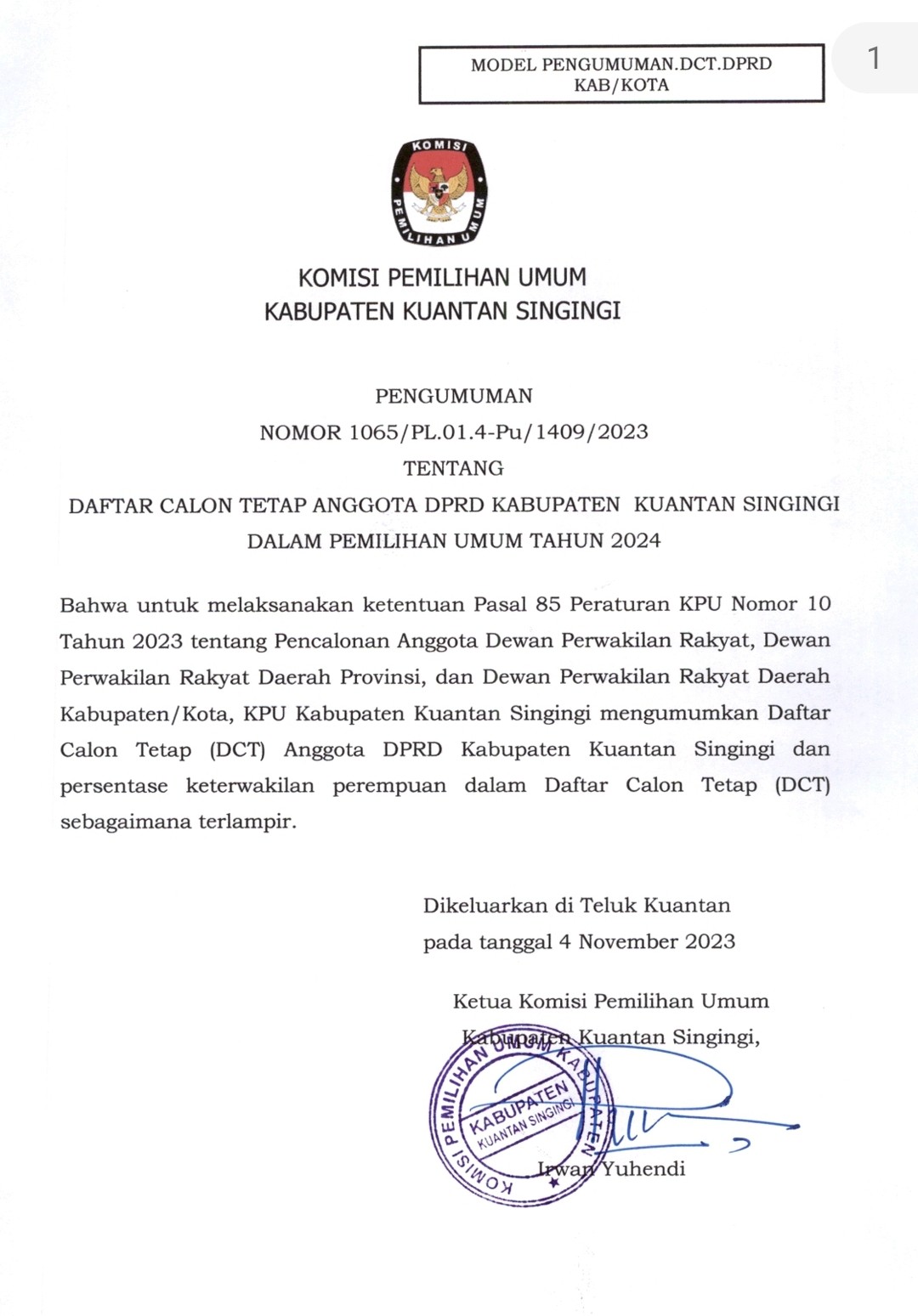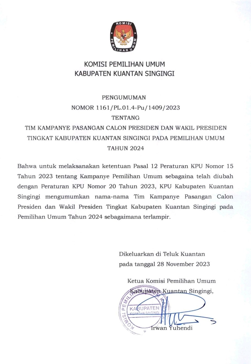 PENGUMUMAN TIM KAMPANYE PASANGAN CALON PRESIDEN DAN WAKIL PRESIDEN TINGKAT KABUPATEN KUANTAN SINGINGI PADA PEMILIHAN UMUM TAHUN 2024