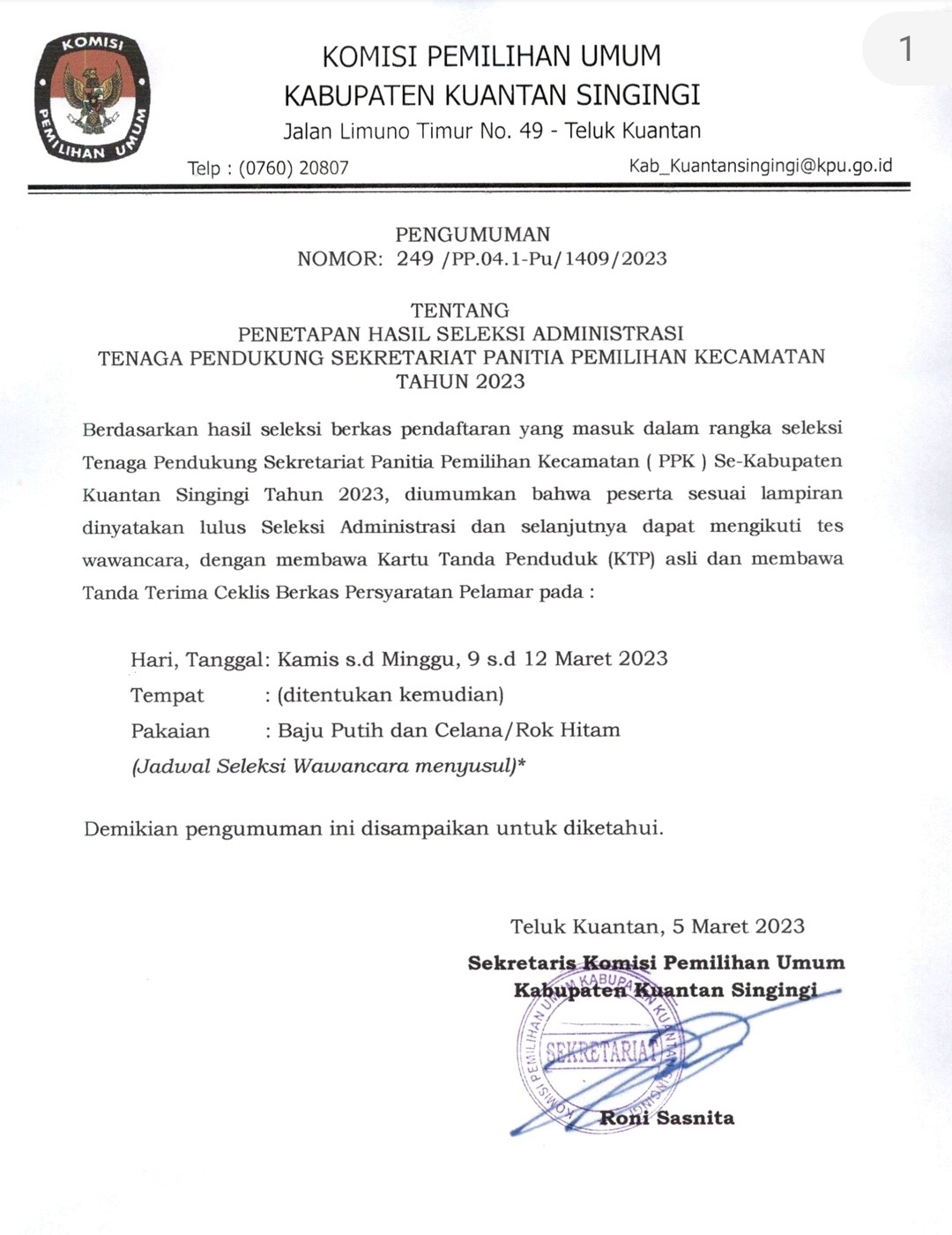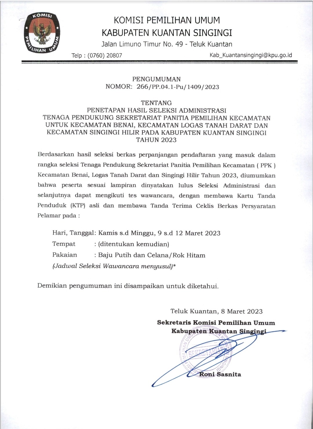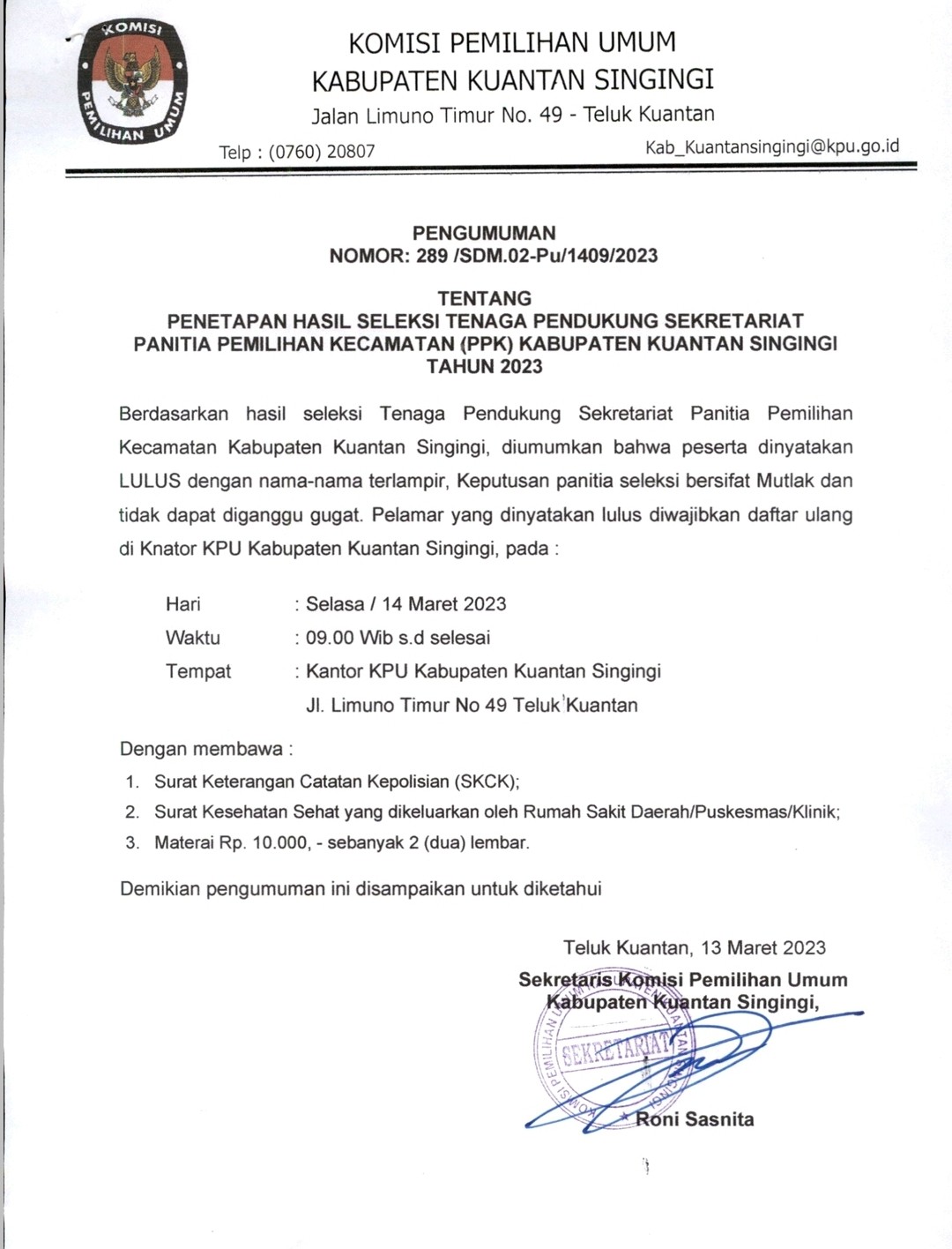 PENGUMUMAN PENETAPAN HASIL SELEKSI TENAGA PENDUKUNG SEKRETARIAT PPK DI KABUPATEN KUANTAN SINGINGI Senin, 13 Maret 2023 00:00 1048 PENGUMUMAN PENETAPAN HASIL SELEKSI TENAGA PENDUKUNG SEKRETARIAT PPK DI KABUPATEN KUANTAN SINGINGI KLIK DISINI Baca Selengkapnya