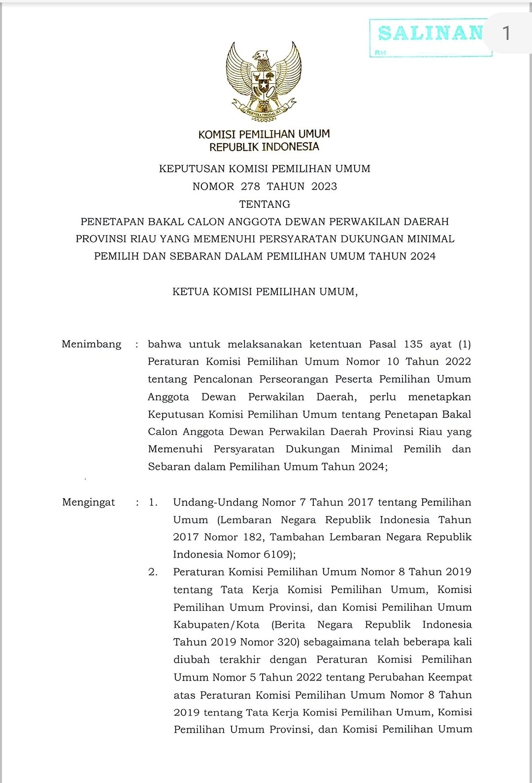 PENETAPAN BAKAL CALON ANGGOTA DPD PROVINSI RIAU YANG MEMENUHI PERSYARATAN DUKUNGAN MINIMAL PEMILIH DAN SEBARAN DALAM PEMILU TAHUN 2024 Kamis, 20 April 2023 00:00 1022 PENETAPAN BAKAL CALON ANGGOTA DPD PROVINSI RIAU YANG MEMENUHI PERSYARATAN DUKUNGAN MINIMAL PEMILIH DAN SEBARAN DALAM PEMILU TAHUN 2024 KLIK DISINI Baca Selengkapnya