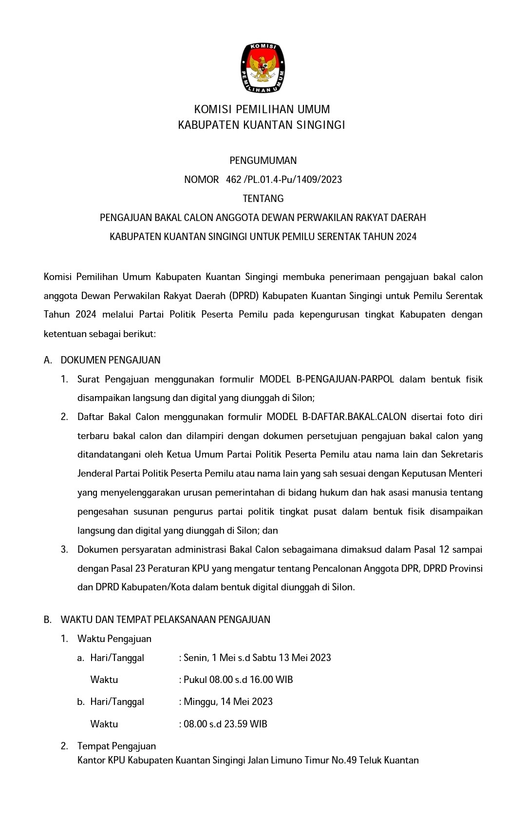 PENGUMUMAN PENGAJUAN BAKAL CALON ANGGOTA DPRD KABUPATEN KUANTAN SINGINGI UNTUK PEMILU SERENTAK TAHUN 2024 Senin, 24 April 2023 00:00 2345 PENGUMUMAN PENGAJUAN BAKAL CALON ANGGOTA DPRD KABUPATEN KUANTAN SINGINGI DALAM PEMILU TAHUN 2024 KLIK DISINI Baca Selengkapnya
