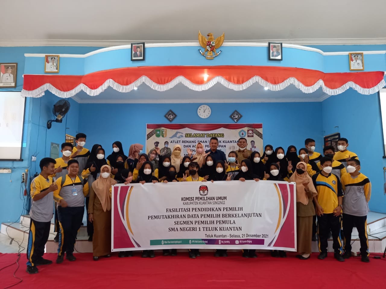KPU Kabupaten Kuantan Singingi (Selasa, 21 Desember 2021) bekerja sama dengan SMA Negeri 1 Teluk Kuantan menyelenggarakan Kegiatan Fasilitasi Pendidikan Pemilih Pemutakhiran Data Pemilih Berkelanjutan Segmen Pemilih Pemula (Fasdiklih Pemutakhiran DPB Segmen Pemilih Pemula). Kegiatan ini diikuti oleh 30 orang siswa dan siswi yang merupakan Pengurus OSIS. Kegiatan ini dihadiri oleh Kepala Sekolah dan Wakil Kepala SMA Negeri 1 Teluk Kuantan. Safrianto Eldi, S.Pd.I, selaku Kepala Sekolah membuka acara dan sekaligus memberikan arahan dalam kegiatan tersebut. Beliau meminta agar seluruh peserta serius dalam mengikuti seluruh rangkaian acara agar program DPB Pemilih Pemula di SMA Negeri 1 Teluk Kuantan ini dapat berjalan dengan baik.