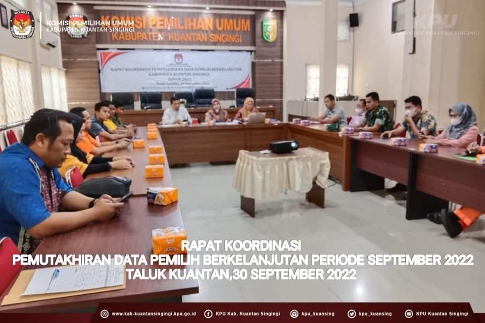 KPU Kabupaten Kuantan Singingi melaksanakan Rapat Koordinasi Pemutakhiran Data Pemilih Berkelanjutan Periode September 2022 pada hari Jumat 30 September 2022 di Aula KPU Kabupaten Kuantan Singingi.