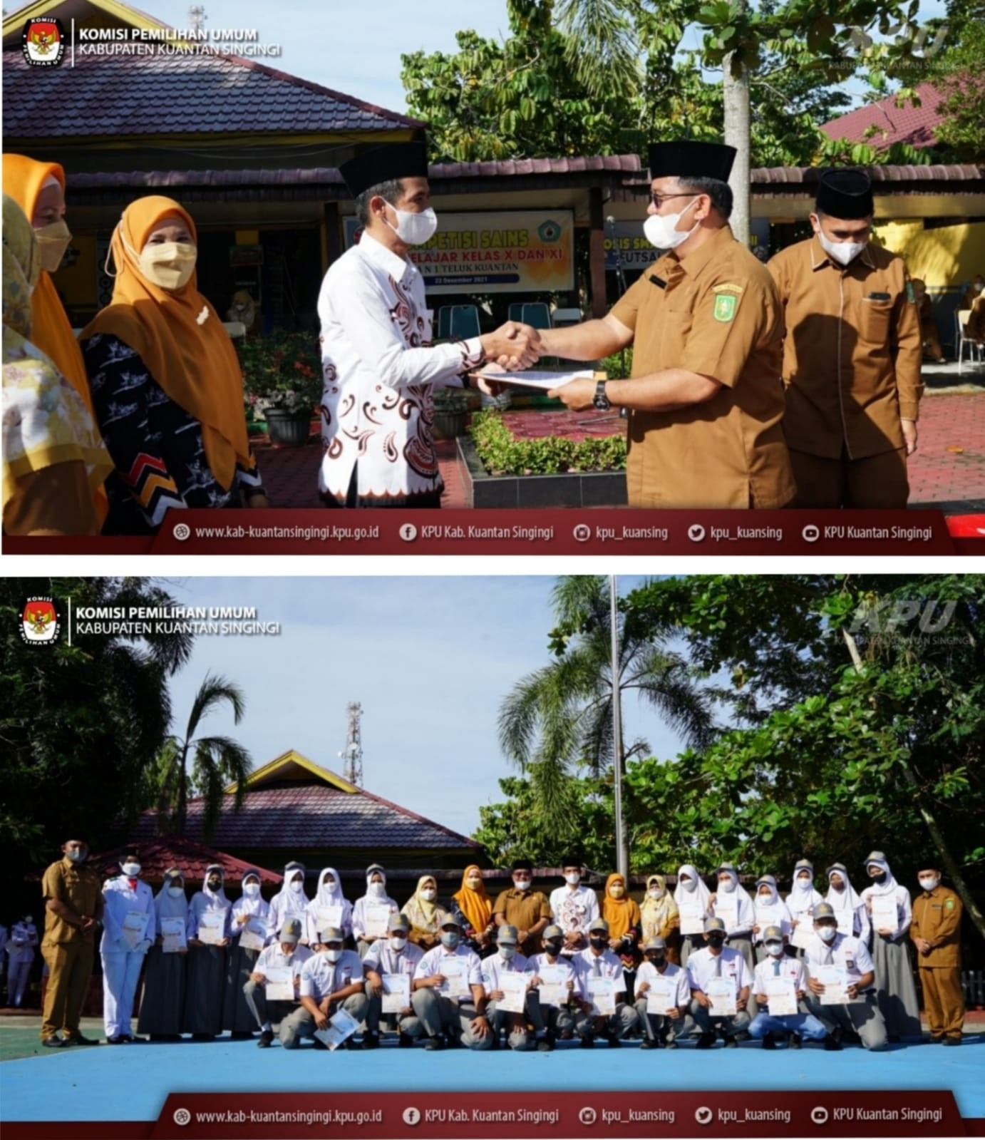 Senin, 7 Februari 2022, Ketua KPU Kabupaten Kuantan Singingi, Irwan Yuhendi, S.T bertindak selaku Pembina Upacara di SMAN 1 Teluk Kuantan. Ini merupakan tindak lanjut dari kegiatan Fasilitasi Pendidikan Pemilih Pemutakhiran Data Pemilih Berkelanjutan Segmen Pemilih Pemula (Fasdiklih Pemutakhiran DPB Segmen Pemilih Pemula) bulan Desember 2021 yang lalu. Turut mendampingi komisioner KPU Kuansing Wigati Iswandhiari, S.T., M.M dan Yeni Gusneli., S.Pd. Dalam amanatnya, Irwan Yuhendi yang juga merupakan alumni SMAN1 Teluk Kuantan memberikan motivasi kepada seluruh siswa/i, bahwa sebagai generasi muda penerus bangsa haruslah mempersiapkan diri dengan tiga komponen untuk menghadapi persaingan global, yaitu karakter, kompetensi dan literasi. Karakter yang dituntut dari generasi abad 21 adalah karakter moral dan karakter kinerja. Untuk kompetensi, siswa harus mampu berpikir kritis, kreatif, kolaboratif dan komunikatif. Sedangkan kemampuan literasi, tidak hanya kemampuan baca tulis namun juga literasi sains, literasi teknologi informasi dan literasi finansial. Hal penting lain yang harus terus ditumbuhkan adalah integritas. Integritas yang baik dan kokoh akan menjadikan Indonesia sebagai bangsa besar di dunia. Setelah pelaksanaan upacara bendera, acara dilanjutkan dengan penandatanganan berita acara kesepakatan koordinasi untuk melakukan kerjasama demokrasi dan kepemiluan, meliputi kegiatan sosialisasi, pendidikan pemilih bagi guru dan siswa/i SMAN 1 Teluk Kuantan, pendampingan dan fasilitasi kegiatan pemilihan ketua dan wakil ketua OSIS dan pemutakhiran data pemilih berkelanjutan segmen pemilih pemula bagi siswa/i SMAN 1 Teluk Kuantan yang berusia 17 tahun sepanjang tahun 2022. Pada kesempatan tersebut, diserahkan juga sertifikat kepada 25 orang siswa/i SMAN 1 Teluk Kuantan yang telah berusia 17 tahun dalam rentang 1 Januari sd 7 Februari 2022 bahwa siswa/I tersebut telah berhak melakukan perekaman data KTP untuk selanjutnya KPU Kuansing akan memutakhirkan sebagai pemilih pemula. Data siswa akan dimutakhirkan pada rekapitulasi data pemilih berkelanjutan yang dilakukan setiap akhir bulan. Program ini akan dilakukan sepanjang tahun 2022 bagi siswa/i SMAN 1 Teluk Kuantan yang berusia 17 tahun. Diharapkan selanjutnya program ini tidak saja dilakukan di SMAN 1 Teluk Kuantan, namun secara bertahap, KPU Kuansing juga akan melakukan kerjasama untuk sosialisasi pendidikan pemilih dan data pemilih berkelanjutan dengan SMA/SMK/MA lainnya di Kabupaten Kuantan Singingi. (KPUKuansing)